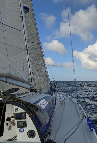 No, not the Singlehanded Sailing Society, instead Serenity, Seamanship, then Speed. So far I had not been at sea more than 16 days, and that was on a heavily crewed boat. Solo, my max was less than 12 days. I had forgotten some essentials. Or more specifically, I knew them but was not acting accordingly. Serenity: the skipper must be at peace so as to be able to focus on the task at hand with his/her undivided attention. Seamanship: everything must be kept under close watch, and if necessary, corrective actions taken swiftly. Do not leave anything for the hand of Neptune. He’s quite mischievous, and will play tricks on you that you hadn’t even thought of possible. Speed: when skipper is happy, and the boat ship shape, then pedal to the metal. Only then. Dang, still shifting to the north. Something will have to be done, and since I want out of the doldrums, I may start the engine again. Look up into the stars! Until next time.