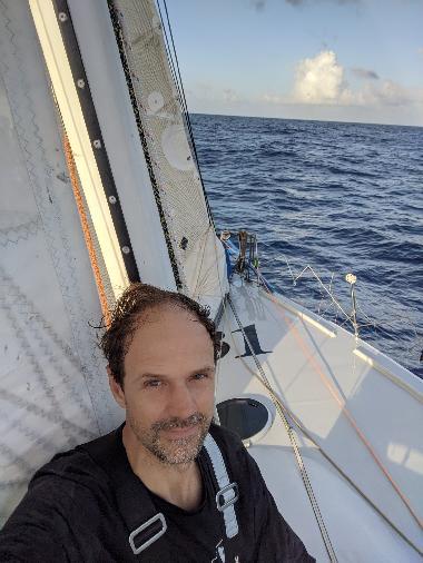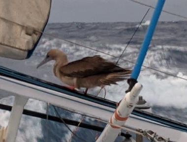 Thursday 22nd. We’re sailing upwind NNW in 6-10 kts of wind. For most of the day three birds were journeying along Changabang. I realized later in the afternoon why. Sometimes we go through a school of flying fish, which scatter in flight, only to perish at the beaks of the flying trio. In between hunts, they challenge each other at landing atop CaB’s mast, with no success so far (see pictures). There’s room up there as we lost the Windex windvane a few days ago. I’ve decided against stopping in Hawaii. There’s a good window to sail home. And I’m not excited at manoeuvering in unknown waters, or dealing with administration. Plus, it’ll make it that much more of a shakedown cruise to carry on straight to San Francisco. I like it here, which makes it that harder to swallow the abandon pill. In other news I didn’t troubleshoot the autopilot, as I didn’t want to stop progress nor cook under the sun (excuses!). I’m going to have to find another marina when I make landfall as Pillar Point Harbor is full for crab season (I had cancelled my lease before leaving in the hope of saving some dough). It was a slow day aboard Changabang, as I tentatively set my eyes on a re-do. Of course we need to fix or replace the boom, replace lost sails, harden the primary autopilot, replace a good bunch of running rigging, pay the hefty WSSRC fees, and a bunch of small other jobs. If you’re still watching, and are anxious for a re-start, please consider refloating our “cruising kitty” by visiting gofundme.com/SF2SF. I know many of you were very generous, and I thank you very much. Every $ helps! $5 is a meal. $20 is the monthly bill for the tracker. $50 is a jerry can of diesel. $140 is the monthly bill for the satellite phone. $300 is the replacement parts for the autopilot. $600 is one spinnaker sock (need 3 of those). $1,500 is a spool of rope to replace worn out running rigging. $2,750 is a new spinnaker (need 3 of those). Anything helps! That’s all from this man. What will tomorrow bring? Fair winds and following seas?