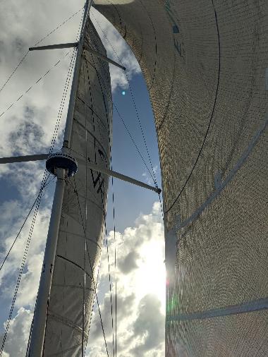 I’m sending a bunch of pictures instead of a load of text. A sunset, a sailor, a funny logo, and what’s left of the small spinnaker. I guess in a way I’ve rehearsed the opening and closing chapter of the full course. Well, when we’ll have made it safely to San Francisco that is.