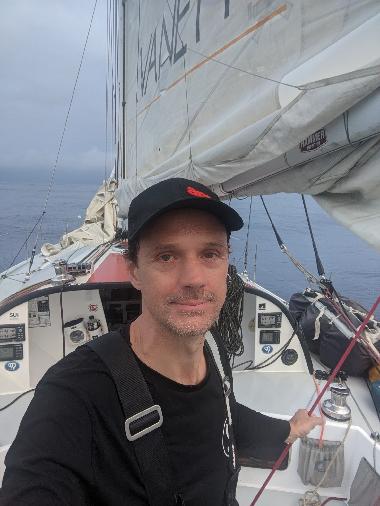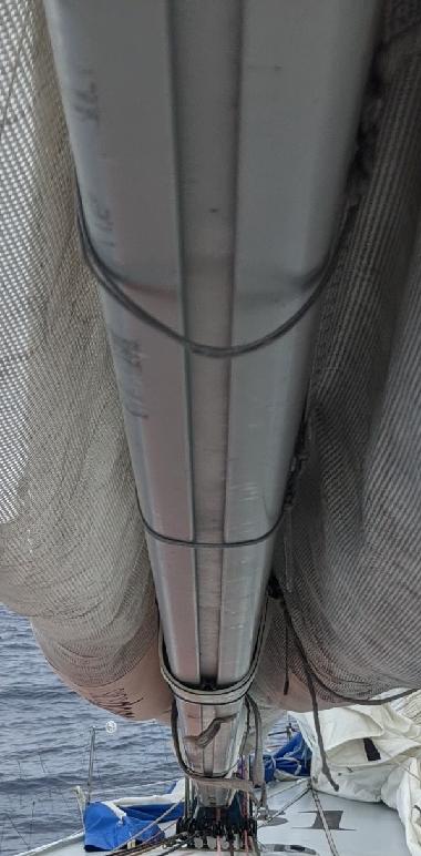 My last post may have sounded like in a way I didn’t care. I do. This sequence of events was not the preferred path, but for some reason I’m resigned, or more specifically looking ahead. I’m uncertain of what will happen next. Tom, Randall and Skip, to the extent possible, are helping with the search for a replacement boom, or a repair, for which I’m very grateful. Then there’s of course the sail home, which is no walk in the park! Finding employment again? Refit Changabang for another start? Train more? Try again? I’m comforted by all the positive comments from everyone. I’m glad too I was able to give you all some excitement! So let’s restate the goal of what started 17 days ago: go South, through the doldrums, hit your first southeasterlies squall, then come back home. That would be some serious shakedown cruise! I will say that in the end, although too late, one competent person did tell me that I should slap a fiberglass sleeve on the boom (which we were considering), and carry on. French. And I agree it would likely work, but should it fail then it would likely do so in the worst place, where recovery of the damage at sea would be hard, where shipping would be very expensive, and other red tape might make delivery a concern. This is not even considering that some countries are closed due to covid-19. There was more than “will the repair hold?” that went into the decision to stay in the Northern hemisphere. Right now, I’m nurturing the boom, probably a little too much, and we’re slogging along. In fact, I motored for an hour or so today. Yesterday, I fixed the 2:1 fractional spinnaker/code O halyard, and had some good learning with the small code 0. Today I played a little with the gennaker. We had to manage a couple squalls with winds hitting 20+ kts on the nose, which all lead to good reefing practice. As night fell we were left with a few knots of wind on the nose, so we’re back to slowly motoring at 3.5 kts. There’s no sound insulation around the engine “room”, which means it’s really loud inside, making sleep impossible for me. Life aboard is just the same as it always was: sleep, wake up finding the boat or sails need attention, prepare food, dispense water, respond to messages, take a nap, adjust the sails, look around for squalls, write a blog post, check emails, use the outdoor “fasealities”, check the weather forecast and ponder where to go, change sail, try something new, take a picture, eat a snack bar, drink, listen to music, fill in the log book, get hit by a squall, brush my teeth, go down to try to sleep, wake up, check boat status, close eyes, drift, wake up, check boat status, adjust sails, try another position in the bunk, what time is it?, drift into a strange dream with a raccoon encounter, wake up, check boat status, is that sunlight? And another day starts. The picture is from yesterday.