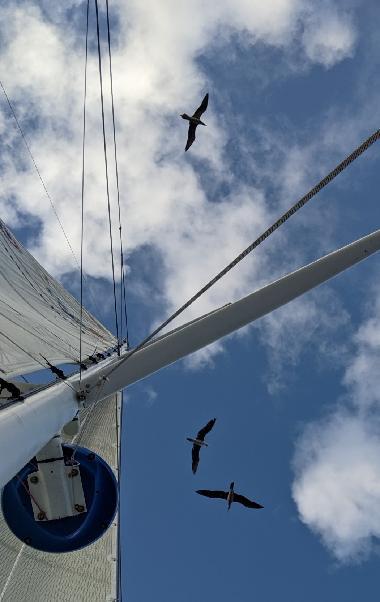 Thursday 22nd. We’re sailing upwind NNW in 6-10 kts of wind. For most of the day three birds were journeying along Changabang. I realized later in the afternoon why. Sometimes we go through a school of flying fish, which scatter in flight, only to perish at the beaks of the flying trio. In between hunts, they challenge each other at landing atop CaB’s mast, with no success so far (see pictures). There’s room up there as we lost the Windex windvane a few days ago. I’ve decided against stopping in Hawaii. There’s a good window to sail home. And I’m not excited at manoeuvering in unknown waters, or dealing with administration. Plus, it’ll make it that much more of a shakedown cruise to carry on straight to San Francisco. I like it here, which makes it that harder to swallow the abandon pill. In other news I didn’t troubleshoot the autopilot, as I didn’t want to stop progress nor cook under the sun (excuses!). I’m going to have to find another marina when I make landfall as Pillar Point Harbor is full for crab season (I had cancelled my lease before leaving in the hope of saving some dough). It was a slow day aboard Changabang, as I tentatively set my eyes on a re-do. Of course we need to fix or replace the boom, replace lost sails, harden the primary autopilot, replace a good bunch of running rigging, pay the hefty WSSRC fees, and a bunch of small other jobs. If you’re still watching, and are anxious for a re-start, please consider refloating our “cruising kitty” by visiting gofundme.com/SF2SF. I know many of you were very generous, and I thank you very much. Every $ helps! $5 is a meal. $20 is the monthly bill for the tracker. $50 is a jerry can of diesel. $140 is the monthly bill for the satellite phone. $300 is the replacement parts for the autopilot. $600 is one spinnaker sock (need 3 of those). $1,500 is a spool of rope to replace worn out running rigging. $2,750 is a new spinnaker (need 3 of those). Anything helps! That’s all from this man. What will tomorrow bring? Fair winds and following seas?