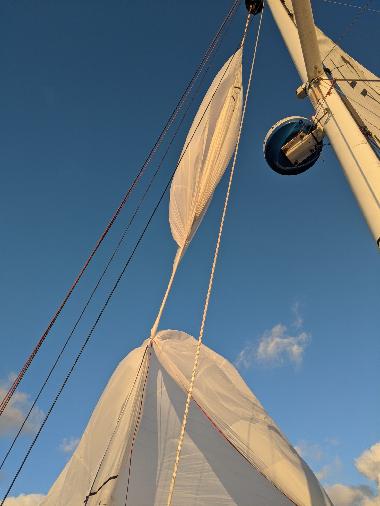 If you’re not into sailing you can skip all this, the summary is: he got into a mess, made it worse then fixed it but lost something important for sailing. Where to begin? As the sun came up a larger wave pushed on the quarter as the AP was coming up to fetch more wind: CaB went into a broach. The AP recovered after a few too many tries, and when I was on deck Big (our biggest spinnaker) had wrapped his many square meters around the sock dousing lines! That’s preferable to a wrap around the stay, so yeah! I had been discussing letterbox drops with Skip so I proceeded. All went fine and Big went into the cabin, probably to have a chat with the AP. At that point I should have listened to my inner “take it ease” voice, and take a rest. But no, I decided to put up another headsail, our medium size spinnaker. So that went up the mast (with the reef in as it was in) only to find out there was a twist in the sock. So it had to come down again, and the twist sorted out. And that’s when the biggest blunder so far happened: I lost a spinnaker sheet. So much for slip knots at the end. That’s a big bummer. Anyways, back inside the cabin, wrestling with a very large sail, a spaghetti of cloth and sheets, I discovered a few tears in the sail, which I fixed (hopefully good enough), but there may be more. I do have another large spinnaker if necessary. Then I untangled the mess (insert a healthy dose of swearing here) and stuffed Big back into its bag. Next was to snuff it back into its sock, using the genoa halyard. Pfew, all in all, about 4 hours of sweating hard inside a hot cabin! As I write this, I lie in my own poodle of sweat. I do have a mini fan with me so I turned it on, but it died right away so it’s back to charging. I have a backup for it in case it’s dead. Not pleased for not listening to my inner voice and losing a spinnaker sheet. Trying to relax a bit now.