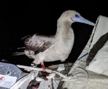 I ended yesterday’s post asking what tomorrow would bring. And I had my answer round midnight: the wind picked up! We’re down to third reef and genoa. My instruments showed 23-26 kts at a true wind angle of just shy of 90°. So the sea state has been building accordingly. We’re going up and down, getting spalshed a good amount. Delightfully, we’re not banging as the sea is mostly to our starboard beam, but it’s still a wild ride, and sleep didn’t come. As of late morning, the wind dropped a few knots. However, forecasts tell me that this will carry on for a few days. The obvious side benefit is that we’re making good progress! It’s unclear what things will look like in a week or so: we may find ourselves in a large wind hole … From feast to famine, as is often the case. The trio split up during the night, leaving me with a hitchhiker! And when he departed this morning, he left his characteristic two tone signature on the deck! I tried a picture of the night sky. Yeah that’s the moon, it didn’t come out too great. All good aboard as I lie down in the shaker.