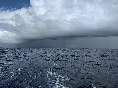 There’s no day off on a sailboat! But first a quick update about the autopilot: I’m not sure anything is resolved but the primary hydraulics are back to driving the boat; all the while the B&G electronics driving the secondary hydraulics have decided to steer the wrong way. I’m puzzled as I didn’t touch the wiring on that system. Thanks to Brian and Tom for helping with this. Several phone calls and emails at least got the primary working again. We sailed all night and part of the morning under mainsail alone, doing reasonable progress. As I looked around us when I came out of the cabin it became clear that we had entered squall and “damn, it’s so hot I’m sweating it all” territory. I wanted to get a headsail back up, and after lots of debate, I went for Big. Because … well who knows? But it’s very light. Big wasn’t happy about going back to work, and he made sure I knew it! Twice I had to struggle the foot out of the water, twice I had to hoist the sock. The truth is: skipper needed a meal! So I had a bunch of granola, blueberries and milk, with water. I also drank a lot.